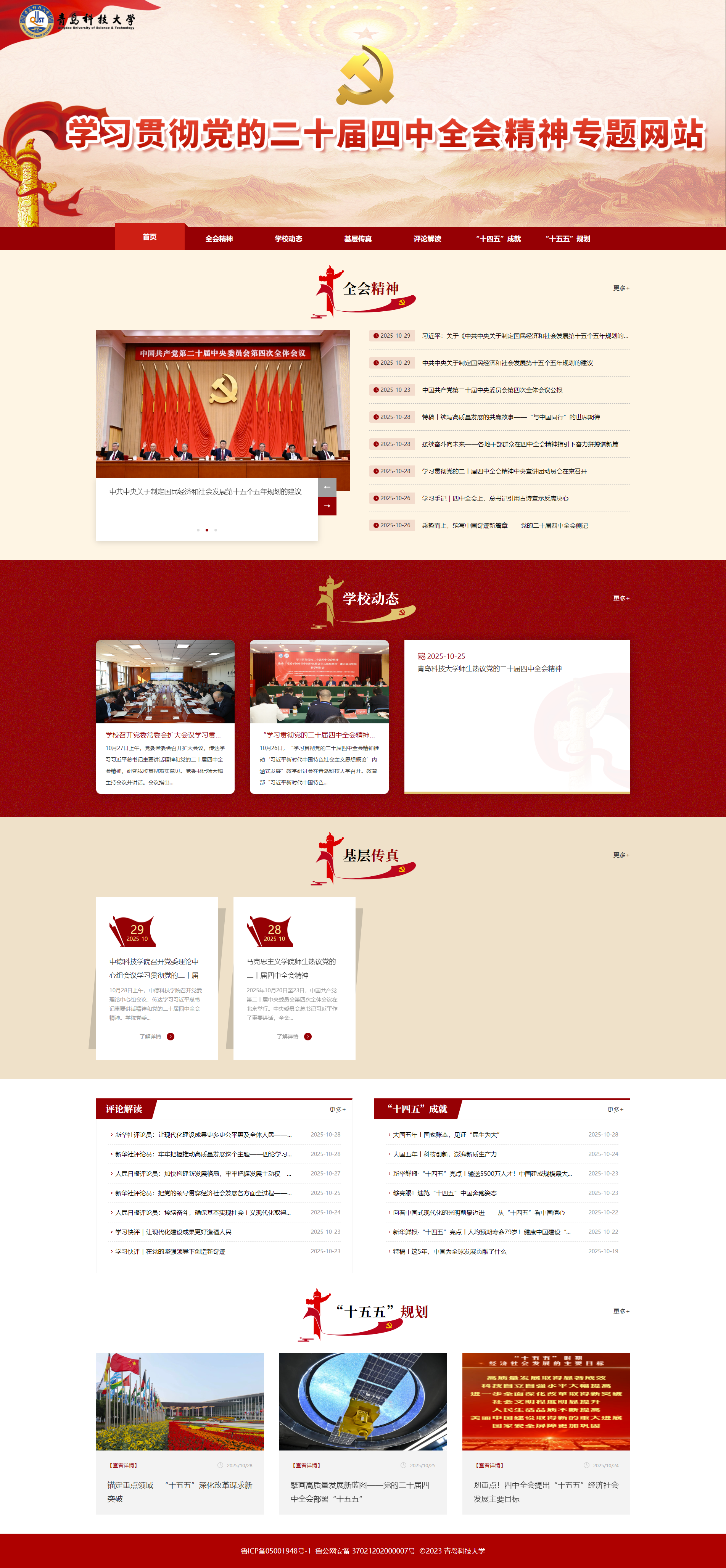 为深入学习贯彻党的二十届四中全会精神,充分展现学校各级党组织学习贯彻党的二十届四中全会精神情况,回顾“十四五”发展成就,做好“十五五”发展规划,把学习全会精神转化为推动学校高质量发展的实际行动,近日,青岛科技大学学习贯彻党的二十届四中全会精神专题网站正式上线运行。