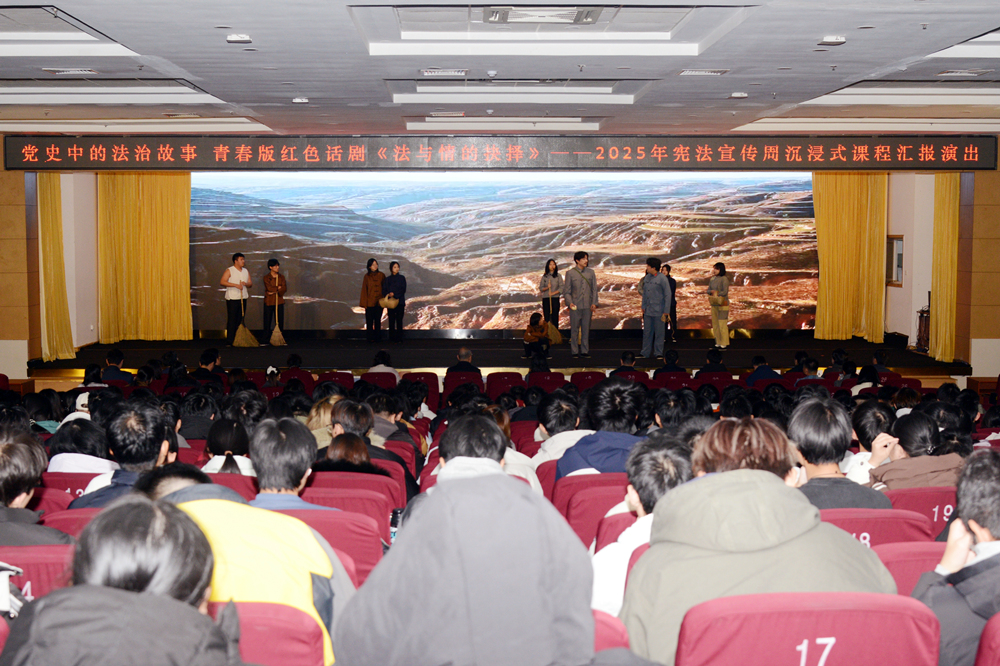 《法与情的抉择》是融党史党纪和国法于一体的大型话剧,故事围绕陕甘宁边区高等法院秉公审理“黄克功案”展开,通过师生共上一堂普法思政课的形式,以现代眼光回溯、剖析历史,重温毛泽东同志《给雷经天的信》,生动展现了以“人民为中心”的革命传统和法治精神,为创建全省依法治校示范校,在法治轨道上深化学校改革、加快治理现代化营造良好的校园文化氛围。