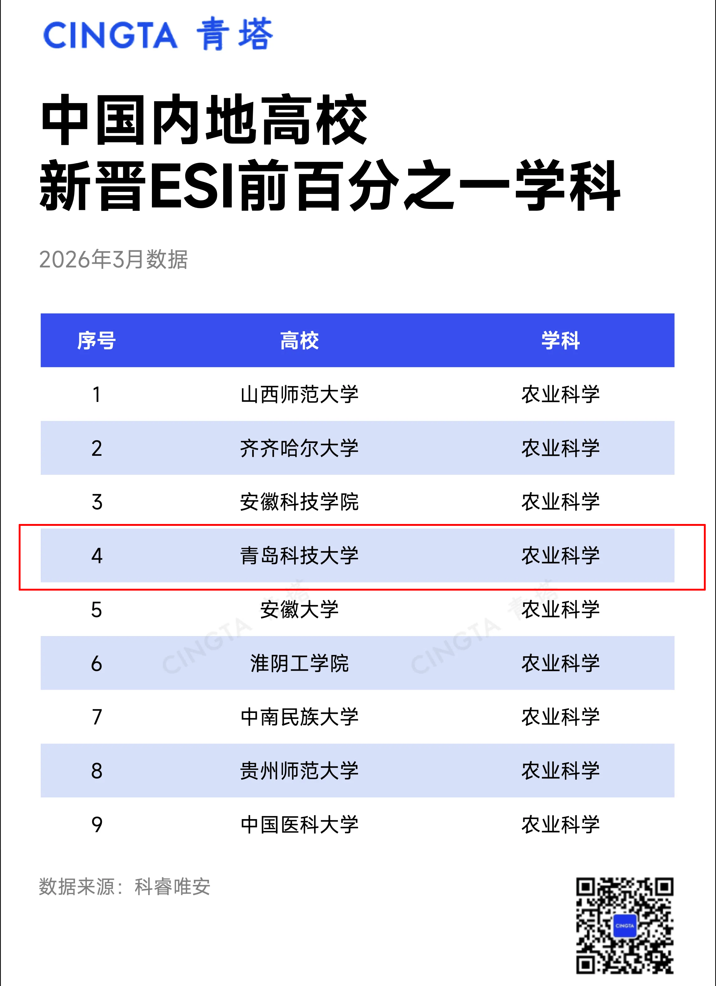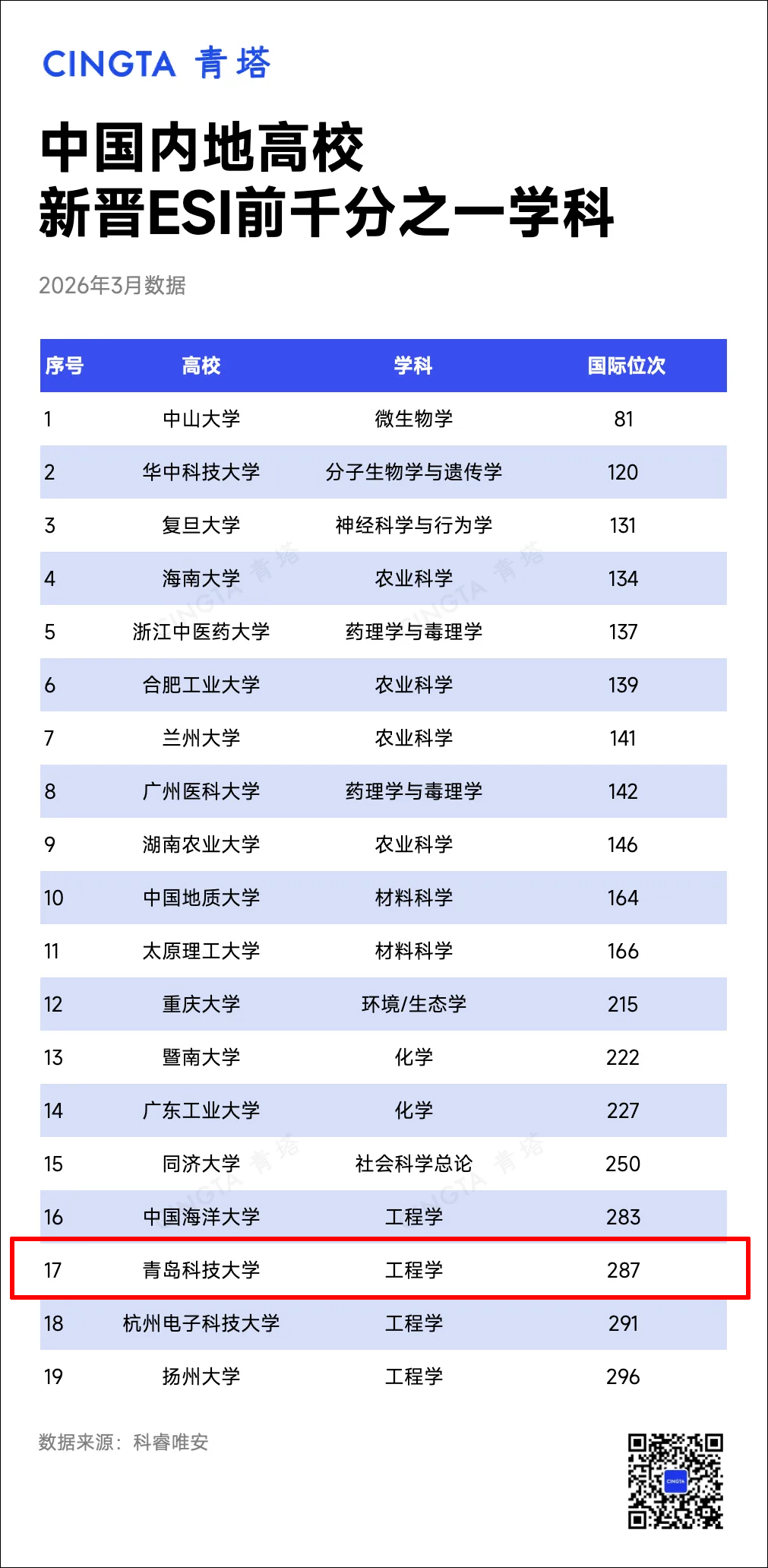 近日,科睿唯安(Clarivate Analytics)发布最新ESI(Essential Science Indicators)统计数据,青岛科技大学学科建设实现双突破:工程学新晋ESI全球排名前1‰、农业科学新晋ESI全球排名前1%。这是学校坚持以学科建设引领高质量发展、深入推进“811”项目建设取得的标志性成果,标志着学校科学研究实力与学术国际影响力迈上新台阶。