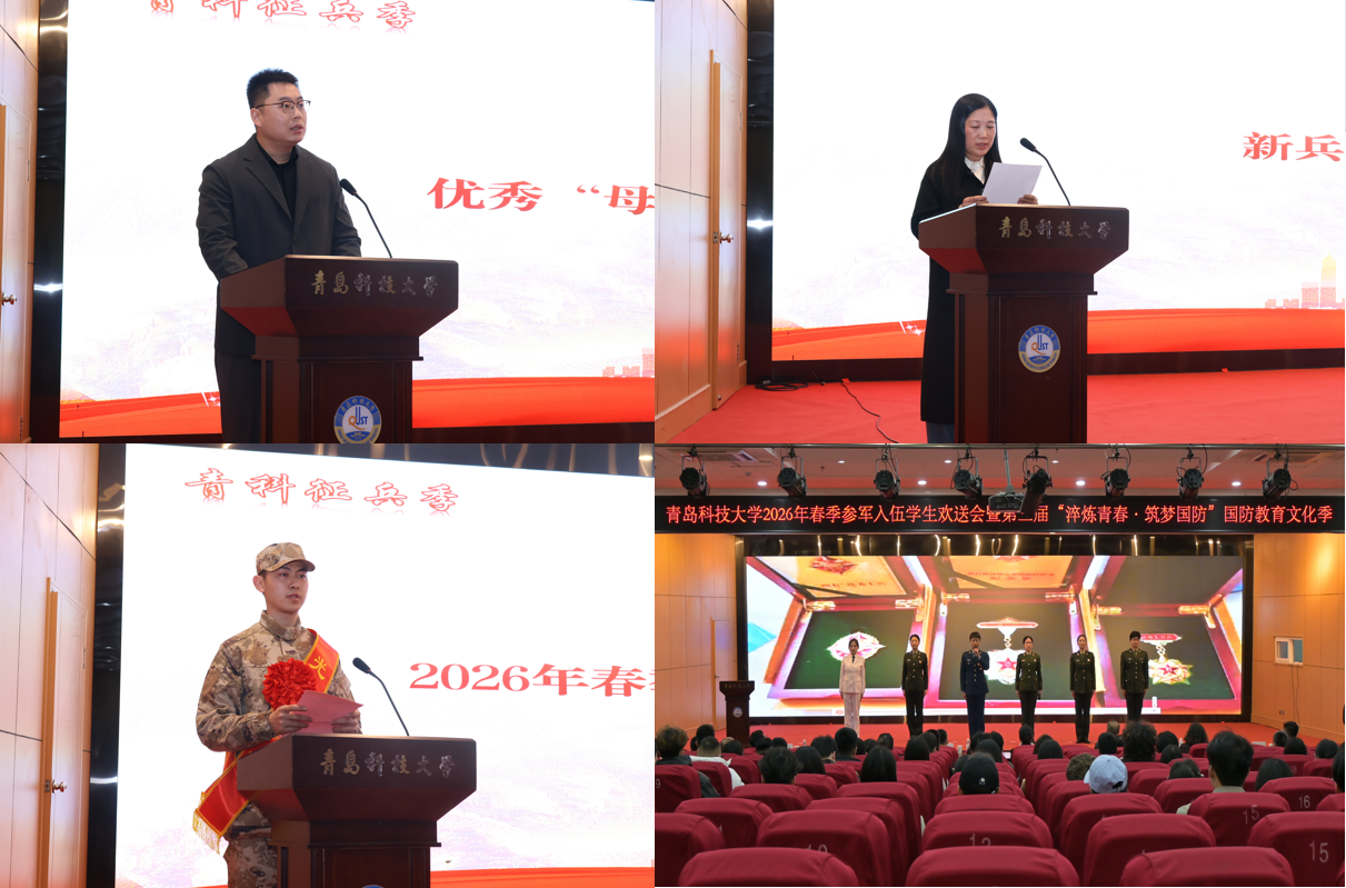 王军伟寄语新入伍学生扎根军营强军报国。张洪坤为应征入伍毕业生颁发青岛科技大学国防奖学金奖牌和荣誉证书。学校党委学生工作部(武装部)部长王丽宣读了《青岛科技大学2026年春季市北区应征入伍大学生士兵名单》,并为首届“优秀母校指导员”颁发荣誉证书。后勤管理处处长匡荣富为“荣军驿站”窗口颁发牌匾。