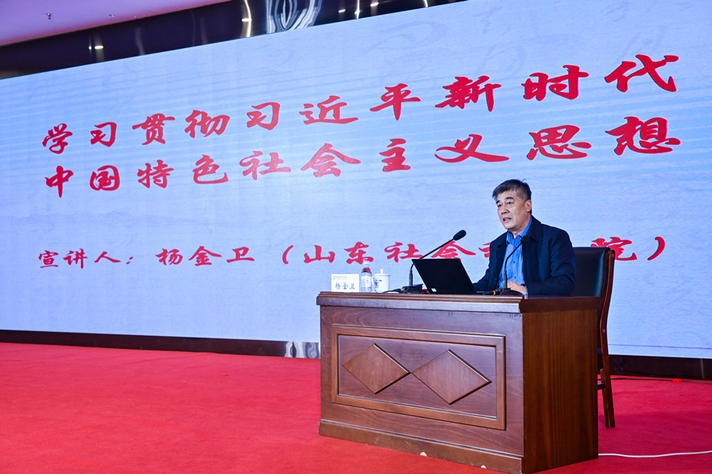 本次宣讲报告会采用“理论宣讲+故事宣讲+小戏小剧+TED演讲”融合宣讲形式,精准对接青年群体理论需求、思想困惑与关心关切,着力把理论讲透彻、把故事讲鲜活、把道理讲明白。山东社科院原副院长杨金卫以“深入学习贯彻习近平新时代中国特色社会主义思想”为主题作理论宣讲,系统阐述了这一思想的重大意义、科学体系、原创性贡献及实践要求,为青年学子进一步学思践悟党的创新理论提供了有力指导。