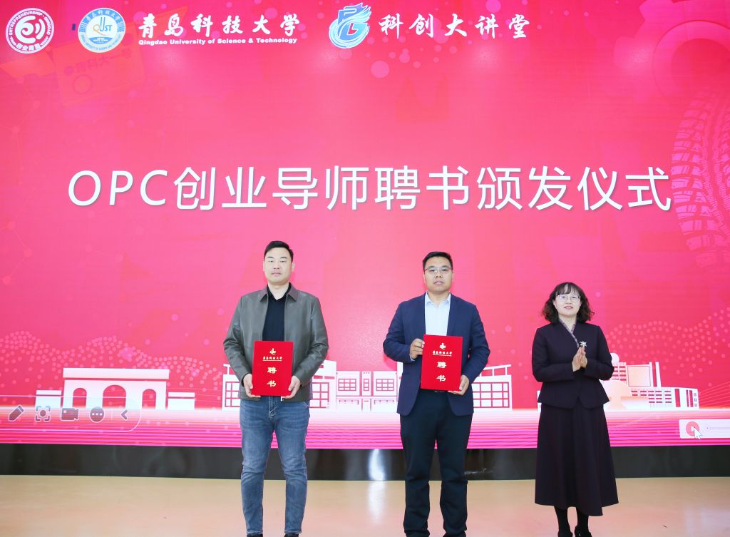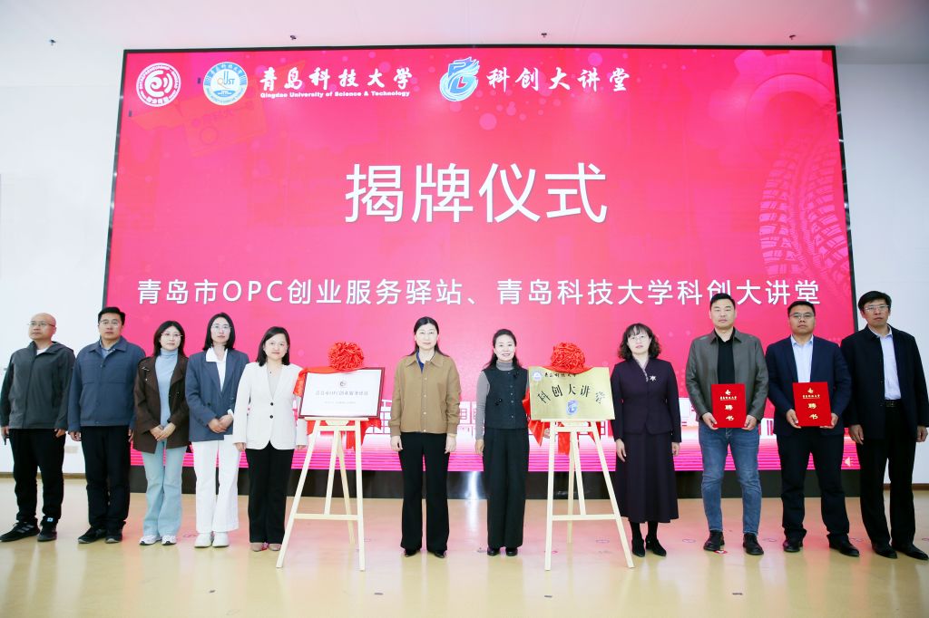 王震、华慧、王新慧、王丽共同为“青岛市OPC创业服务驿站”“青岛科技大学科创大讲堂”揭牌。王丽为李东浩、高伟两位企业家颁发“OPC创业导师”聘书。